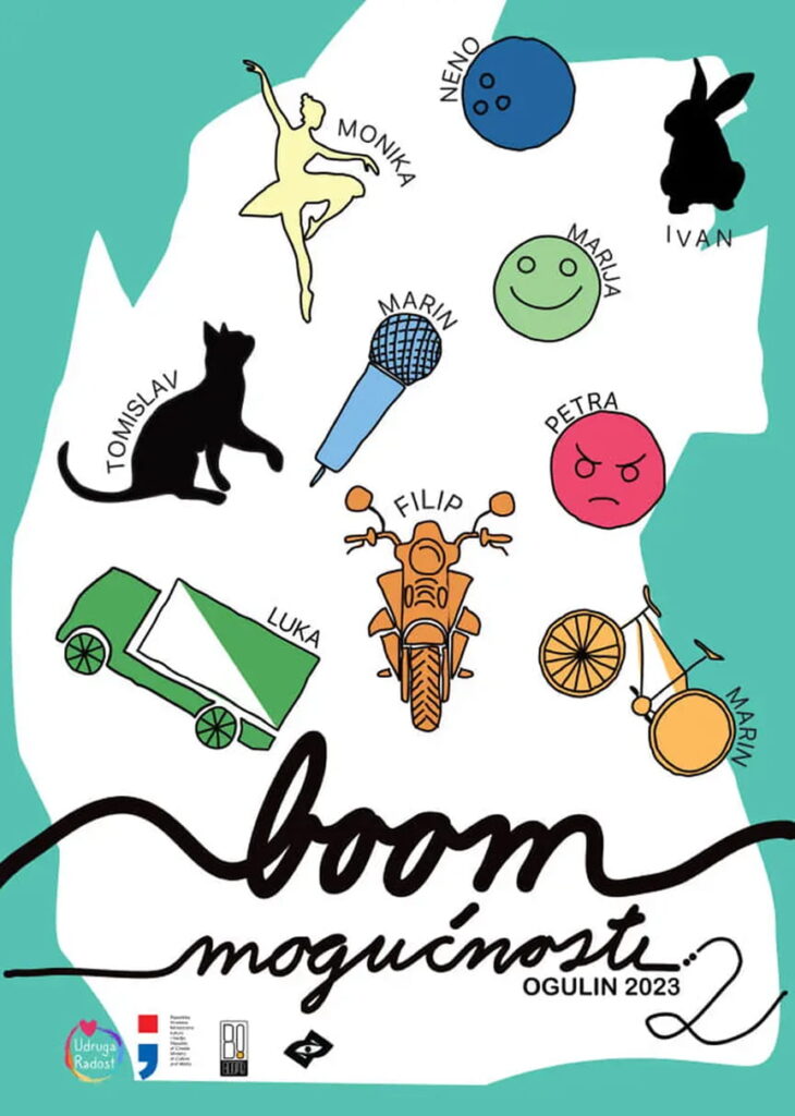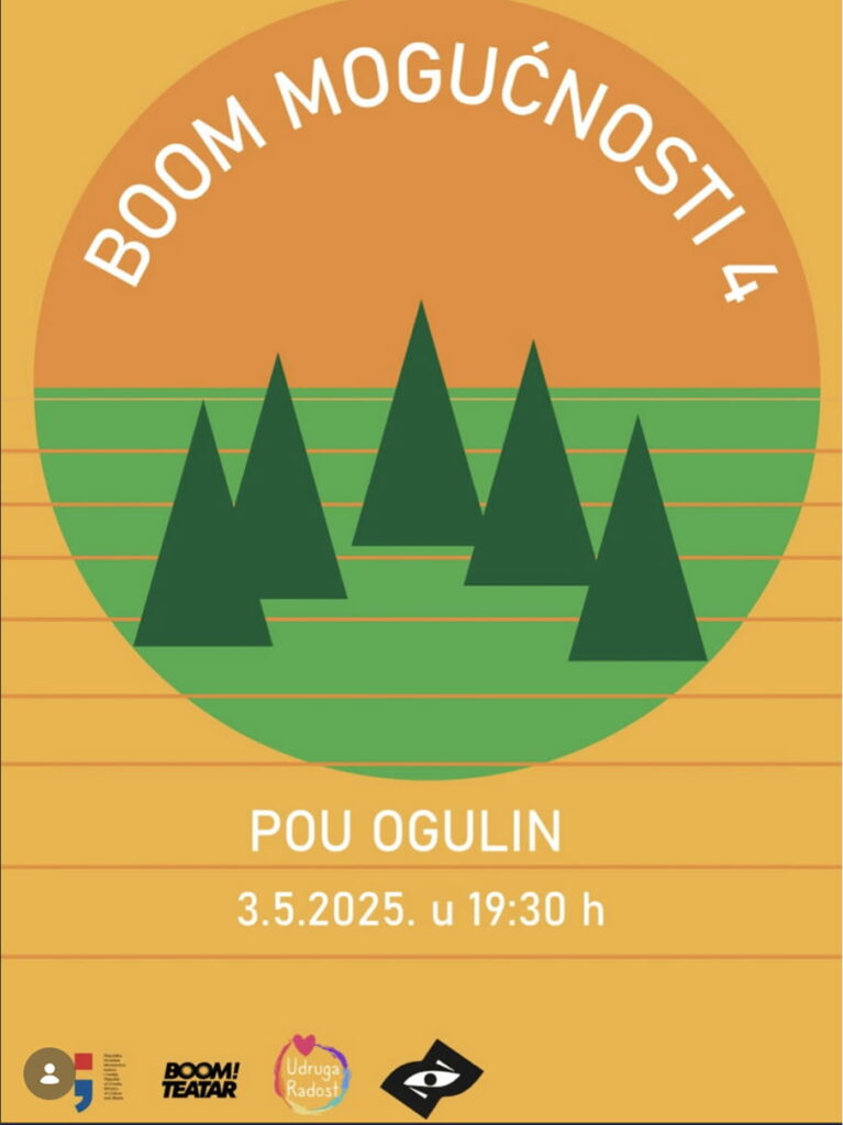Program „Boom mogućnosti“ provodimo već 5 godina od 2021. Od samog početka projekt je u partnerstvu s Udrugom „Radost“ i Pučkim otvorenim učilištem Ogulin. Kroz 5 godina održali smo niz dramskih, glazbenih, likovnih, svjetlosnih, filmskih i drugih kreativnih i interdisciplinarnih radionica. Na ovom projektu skupili smo šarolik tim suradnika od glumaca i kazališnih i filmskih redatelja, do glazbenika, pisaca, komunikologa, psihologa i edukacijskih rehabilitatora. Sve radionice usmjerene su isključivo na osobe s invaliditetom i djecu i mlade s teškoćama u razvoju. Projekt je sufinanciran sredstvima Ministarstva kulture i medija RH.